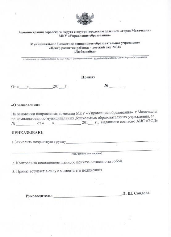 Распорядительный акт о зачислении ребенка в образовательную организацию
